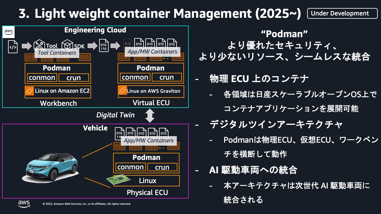 図4:開発環境だけでなく量産車の実ECUにもコンテナ技術を採用している(出典:アマゾン ウェブ サービス ジャパン)拡大画像表示