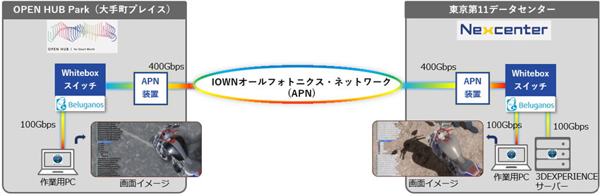 実証は、東京第11データセンター(東京都武蔵野市)と大手町プレイスにあるOPEN HUB Park(東京都千代田区)をAPNで接続し、ダッソー・システムズの3D CADソフトウェア「3DEXPERIENCE」を使って遠隔共同編集を実施した。