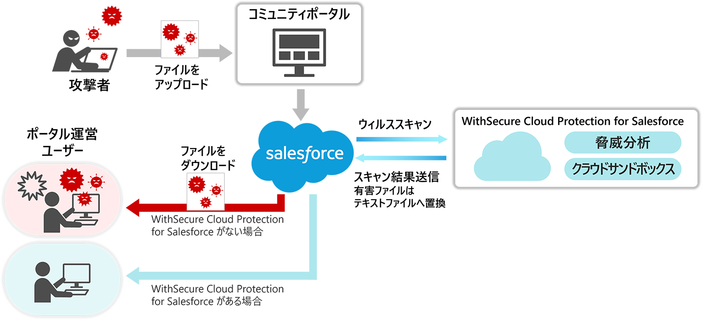 背景として、Salesforceの機能を使って顧客や取引先との接点となるポータル画面を構築する需要が高まっている。一方、Salesforceの標準機能ではファイル添付に対してウイルススキャンを実施せず、顧客ポータルや代理店ポータルにアップロードするファイルがリスクになる。