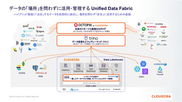 図1:場所を問わすに各種データを活用する機能「Unified Data Fabric」の概要(出典:Cloudera)拡大画像表示