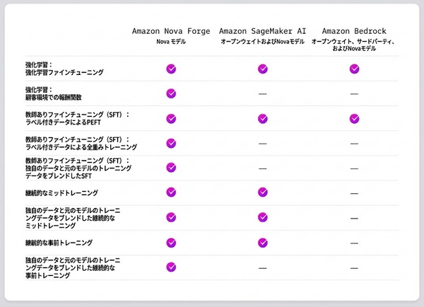 合わせて、自社データでAIモデルをカスタマイズ可能なAIモデル構築支援サービス「Amazon Nova Forge」(図2)を活用している。初期検証では、同プログラムを通じて開発したAIエージェントにより、社内のドキュメント評価・審査プロセスの効率が従来比で約100倍に向上する可能性が示されたという。