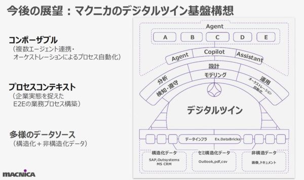 安藤氏は今後の展開として、ビジネスプロセスの最適化と軌を一にしたデジタルツイン基盤構想を明かした(図6)。