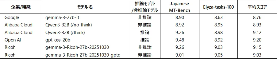 開発した日本語LLMの実際の性能について、リコーは、「ELYZA-tasks-100」ベンチマークプログラムを用いて、同規模パラメータ数のLLMとの比較を行った。その結果、米OpenAIのオープンウェイトモデル「gpt-oss-20b」などの高性能モデルと同等の性能を確認した(図1)。