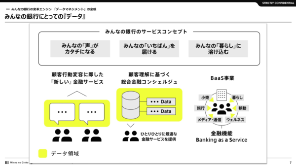 顧客の行動変容に応じた新しい金融サービスの創造、顧客理解に基づくサービスの最適化、BaaS事業を通じた異業種サービスとの融合──3つのサービスコンセプトのすべてにおいて、「データ」は不可欠だ(図1)。みんなの銀行/ゼロバンク・デザインファクトリー データ戦略部 データディベロップメントグループ グループ長の本嶋大嗣氏(写真1)は、「データはあらゆる取り組みのベースになっている」と強調する。本嶋氏の肩書きにあるゼロバンク・デザインファクトリーは、みんなの銀行のバンキングシステムの開発を担う関連会社である。