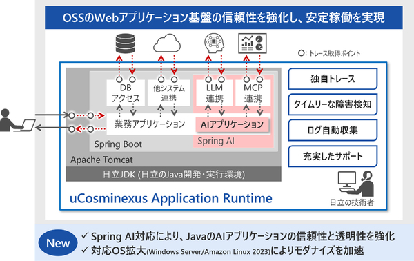 日立製作所は2025年12月10日、Javaアプリケーションサーバーの高信頼化アドイン新版「uCosminexus Application Runtime V1.20」をリリースした。同アドインは、Apache Tomcat/Spring BootによるJavaアプリケーションサーバーに、トレースや障害検知などのRAS(信頼性・可用性・保守性)機構を追加する製品。新版では、JavaによるAIアプリケーション開発・実行のためのSpring AIに対応したほか、動作環境にWindows ServerとAmazon Linux 2023を追加した。価格(税別)は月額2万2300円から。