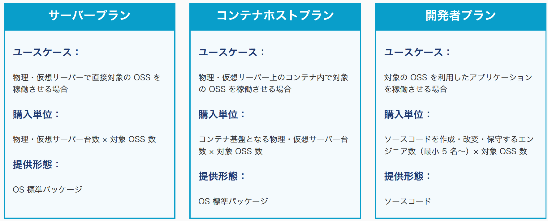 ユーザー向けと開発者向けのプランを用意している。ユーザー向けは、通常の「サーバープラン」と、コンテナ内で対象OSSを利用する「コンテナホストプラン」。開発者向けは、対象OSSを組み込んだソフトウェアの開発・実行のための「開発者プラン」である(図2)。
