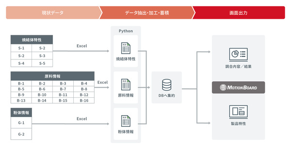 ほかには、切削工具の製造工程における素材の調合業務を標準化している。原料投入から最終検査までの一連のデータを管理するシステムを開発し、調合内容と製品特性の関係を可視化した(図4)。