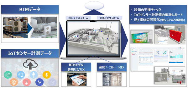IoTデータや点検記録などを、BIM(Building Information Modeling:建築情報モデリング)による3Dモデルに集約して、「設備のデジタルツイン」を構築する。情報の分散を解消して、現場担当者から経営層までが3Dダッシュボードの同じ情報を見て議論できる環境を構築する(図1)。