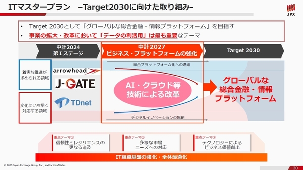東京証券取引所や大阪取引所、東京商品取引所を傘下に持つ日本取引所グループ(JPX、本社:大阪市中央区)は、中期経営計画において、2030年にありたい姿として「グローバルな総合金融・情報プラットフォーム」を掲げている(図1)。従来のビジネスの中心である有価証券の売買に加えて、投資家をはじめとする市場関係者への情報提供を通じた価値創出を目指す考えだ。