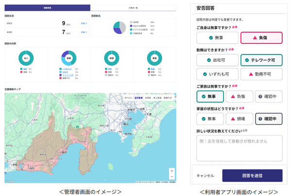 管理者向けの機能として、従業員の位置情報を地図上で確認できるほか、同じ画面で安否回答の集計状況も把握できるUIを備える(画面1)。従業員側では、スマホアプリで自身の状況を選択するだけで回答できる。