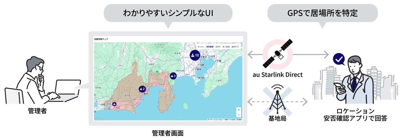 従業員が持つスマートフォンのGPS情報を活用する。被災地付近に滞在している従業員に対して安否確認の連絡を自動で送信し、回答を収集・可視化する。マルチキャリアに対応しており、au以外のスマートフォンを利用している従業員も対象となる(図1)。