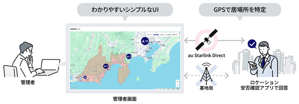 KDDIは2025年12月18日、従業員安否確認サービス「ロケーション安否確認」を同年12月19日から提供すると発表した。従業員のスマートフォンの位置情報(GPS)から、被災地付近にいる従業員に対して安否確認連絡を自動送信し、回答を収集・可視化する。安否回答がなければ被災者の家族に連絡をとることもできる。衛星通信サービス「au Starlink Direct」の利用により圏外エリアでも安否を確認できる。