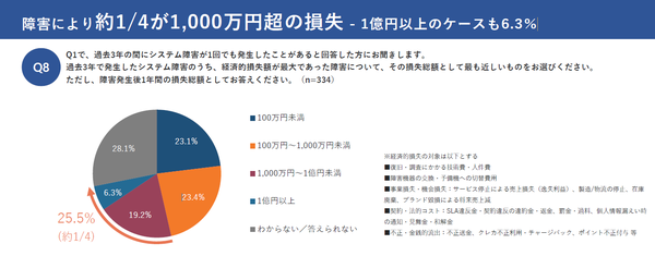 図3は、過去3年間で発生したシステム障害のうち、経済的損失額が最大となった障害について、障害発生後1年間の損失総額を聞いた結果だ。最多は「100万~1000万円未満」(23.4%)で、「100万円未満」(23.1%)、「1000万~1億円未満」(19.2%)が続いた。4社に1社が1000万円以上の損失を経験しており、「1億円以上」と回答した企業も6.3%あった。