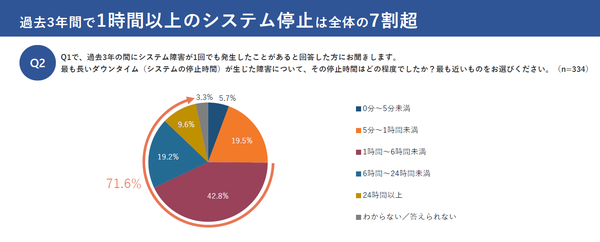 過去3年間に発生したシステム障害のうち、最も長いダウンタイム(停止時間)を聞いたところ、「1時間~6時間未満」(42.8%)が最も多く、次いで「5分~1時間未満」(19.5%)、「6時間~24時間未満」(19.2%)と続いた。過去3年間で1時間以上のシステム停止を経験した企業は全体の7割超に上っている図2)。