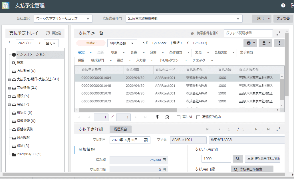 画面1:「HUE」の支払予定機能の画面例(出典:ワークスアプリケーションズ)拡大画像表示