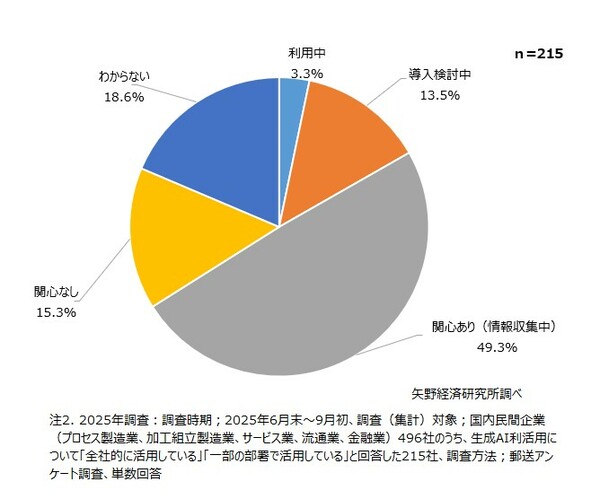 矢野経済研究所は、国内企業における生成AI/AIエージェントの利用実態を調査した。2025年6月末~9月初旬、国内の民間企業(プロセス製造業、加工組立製造業、サービス業、流通業、金融業)500社を対象に、直接面談、電話/メールによるヒアリング、アンケートなどで調査を行った。