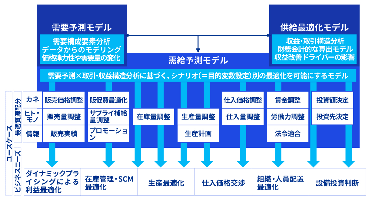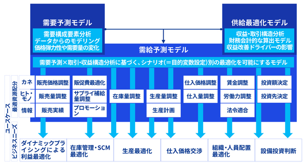需要に影響を及ぼす構成要素を分析し、統計的モデルや機械学習モデルにデータを学習させ、価格弾力性や需要量の変化を明らかにする。さらに、会計観点で収益・取引構造を分析し、価格、販売量、固定費、変動費などの影響をシミュレーションによって把握する。