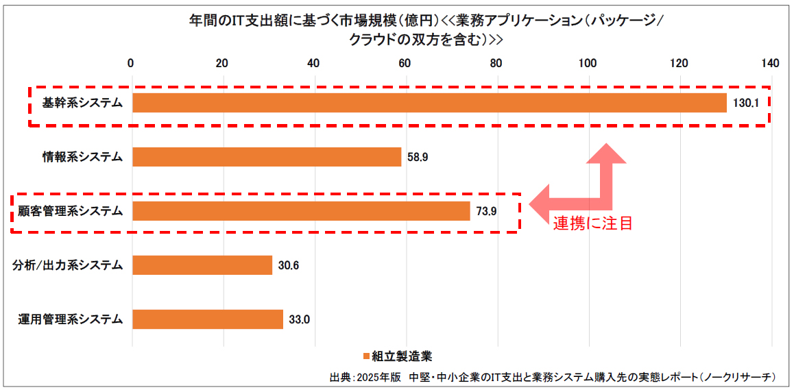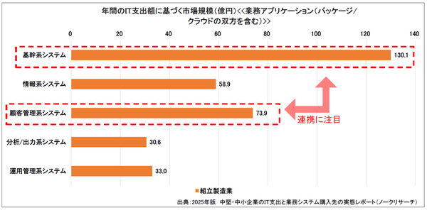 「顧客管理系システム」は2番目に高い。「中堅・中小市場においても、納期回答や受注予測の精度向上などを目的に、生産管理システムと営業支援システム(SFA)の連携が進みつつある」とノークリサーチは分析する。