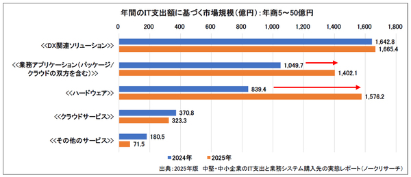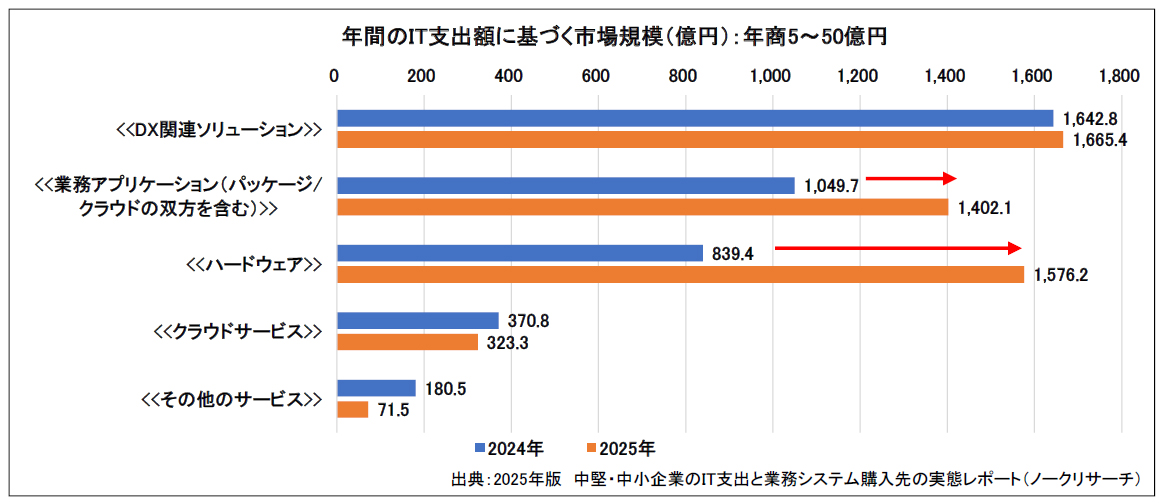 図2:年商5~50億円(中小企業層)における商品カテゴリ別のIT支出(出典:ノークリサーチ)拡大画像表示