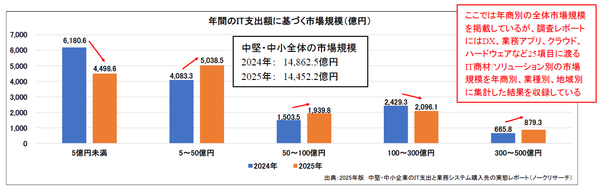 2025年の中堅・中小向けIT市場規模の合計値は1兆4452億2000万円で、2024年(1超4862億5000万円)と比べて概ね横ばいだった。年商別では、小規模企業層(年商5億円未満)で大幅減、中堅・中位企業層(年商100~300億円)で微減である点を除き、他の年商区分では増加した(図1)。