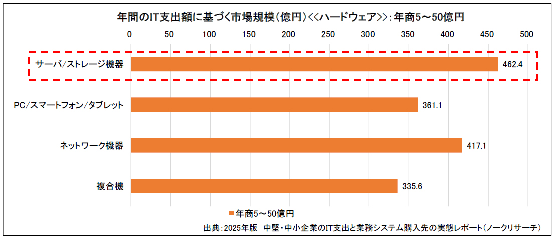 図3:年商5~50億円(中小企業層)におけるハードウェアの支出内訳(出典:ノークリサーチ)拡大画像表示