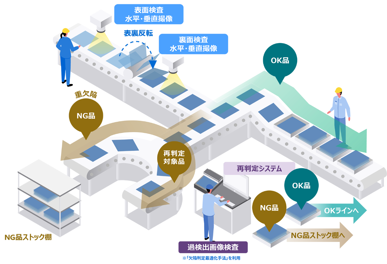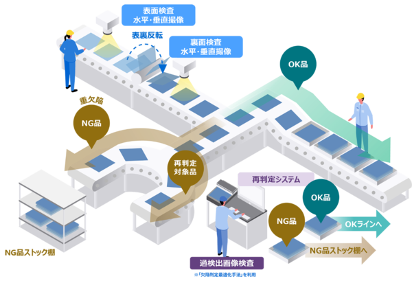 図2:枚葉シート検査を例にした外観検査システムの全体イメージ(出典:東芝デジタルソリューションズ)拡大画像表示