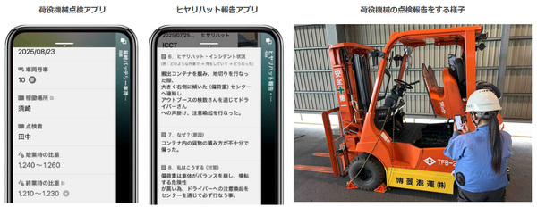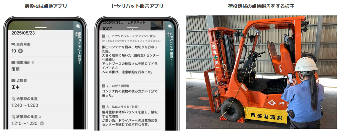 図1:博菱港運がノーコード開発ツールで作成した、荷役機械の点検報告アプリの画面と利用シーン(出典:アステリア)拡大画像表示