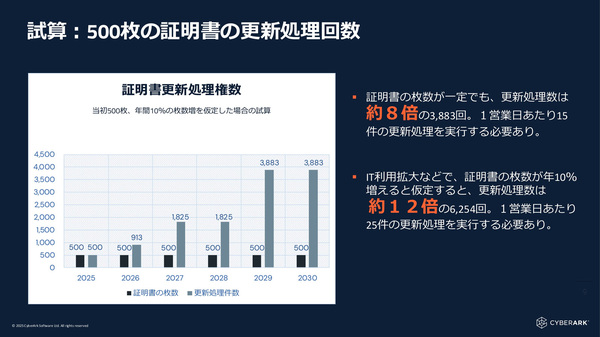 遠い将来の話ではなく、2026年3月には早くも有効期限が半減する。その後、段階的に最大47日にまで有効期限が短くなると、2029年には更新頻度は現状の約8倍になる(図2)。CyberArkは、「事業が成長してサーバー証明書の必要数が増えると、さらに更新回数は増える」(染谷氏)ことへの注意を促している。