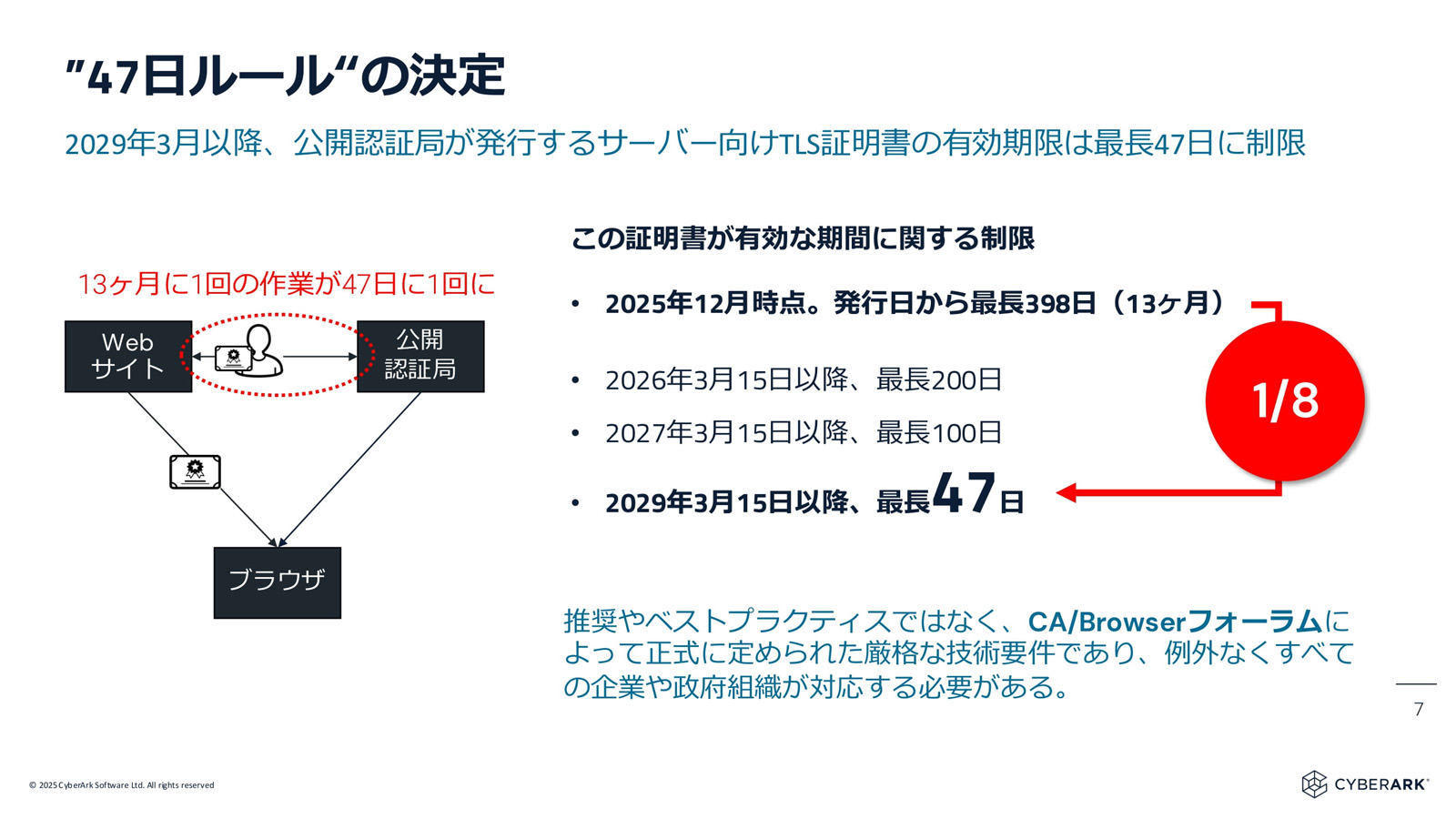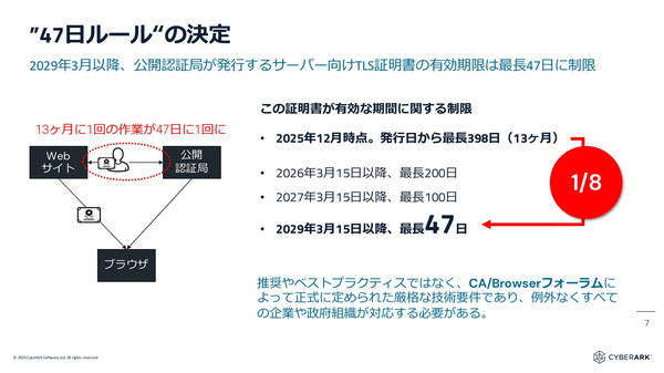2029年3月、SSL/TLSサーバー証明書の有効期間が、現在の最長398日が最長47日間に短縮され、現在年1回で済んでいる更新作業が年8回以上に増える。CyberArk Softwareは2025年12月24日、都内で説明会を開き、大半が手作業でサーバー証明書を更新している現状下で企業が抱えるリスクを挙げ、作業の自動化を急ぐ必要性を説いた。