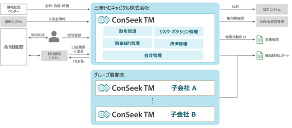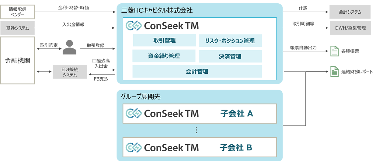 ConSeek TMは、ローンや社債・CP発行などの資金調達取引から、定期預金やグループ貸付などの資金運用、デリバティブや有価証券運用まで、多様な金融商品をカバーする。機能面では、取引管理、キャッシュフロー生成、決済管理、リスク管理、レポートなどを標準で備えている。