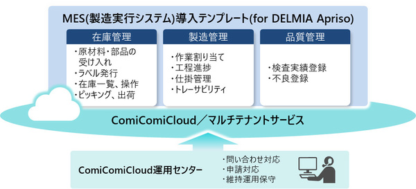 在庫管理・製造管理・品質管理など製造業の業務プロセスのテンプレートを、システム監視やバックアップ、システムリソース管理などを日立が行うマネージド型のComiComiCloudとセットで提供する。これにより、ゼロからの要件定義やインフラ構築が不要となり、短期間でMESを導入可能となる。