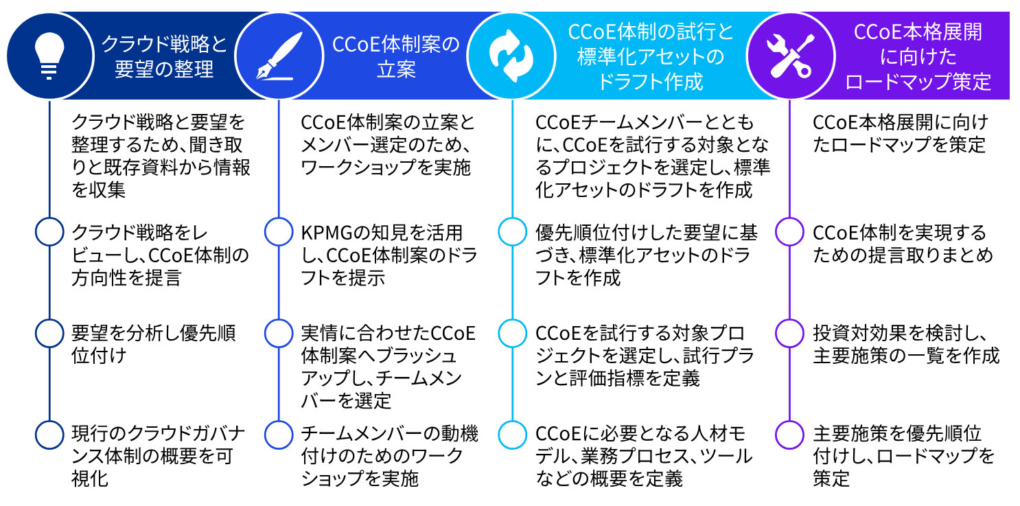- CCoE体制の立案:CCoE体制のドラフトを提示し、実情に合わせたCCoE体制案へとブラッシュアップする。チームメンバーを選定し、メンバーの動機づけのためのワークショップを実施する。