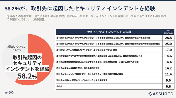 図4:取引先に起因したインシデントを経験した割合とインシデントの内容(出典:アシュアード)拡大画像表示