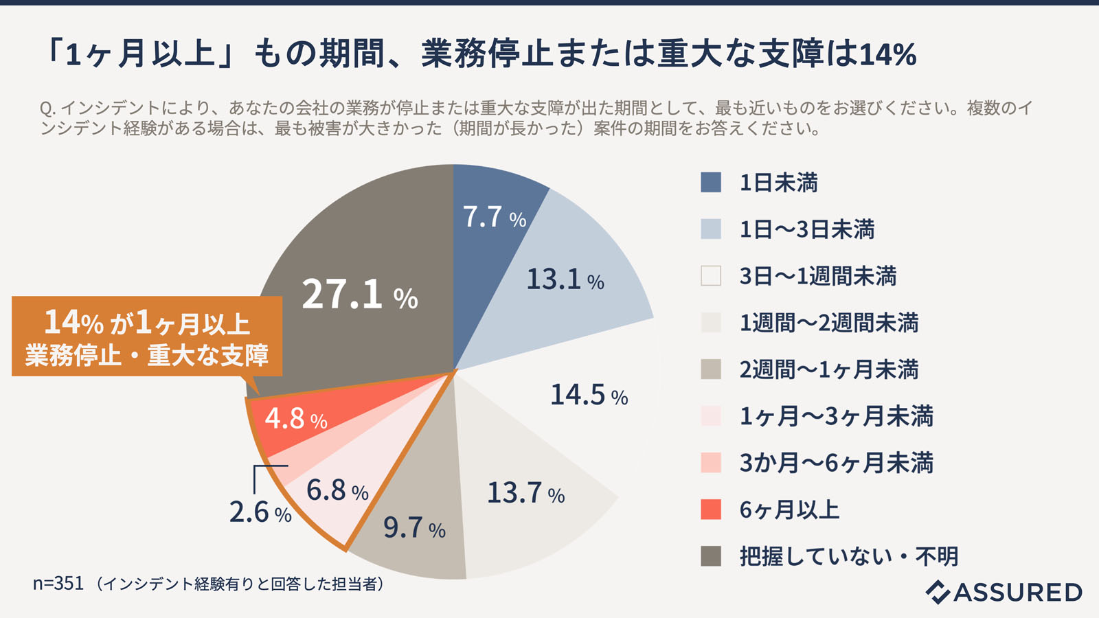 インシデントによって業務が停止または重大な支障が出た期間は「1週間未満」が最多で、「1カ月以上」と回答した企業は14.2%に上った(図2)。アシュアードは、一度セキュリティインシデントが発生すると復旧までに長期化を要し、事業へ甚大な影響を与えることを指摘。「被害が拡大する前の段階でセキュリティインシデントを食い止め、対応期間を最小化するための経営努力が強く求められる」としている。