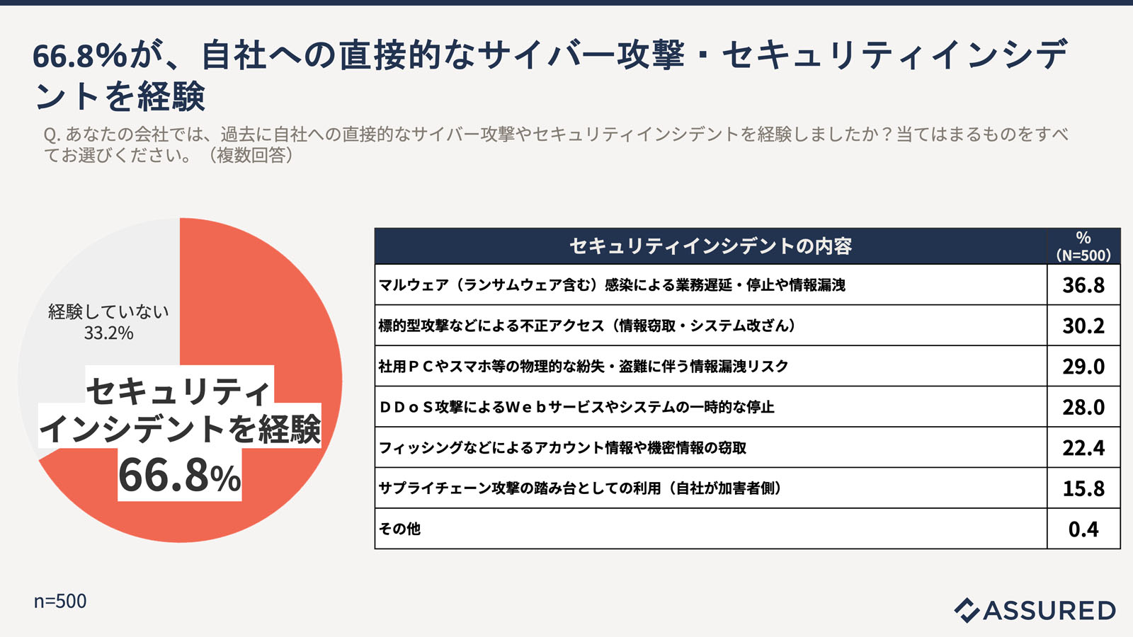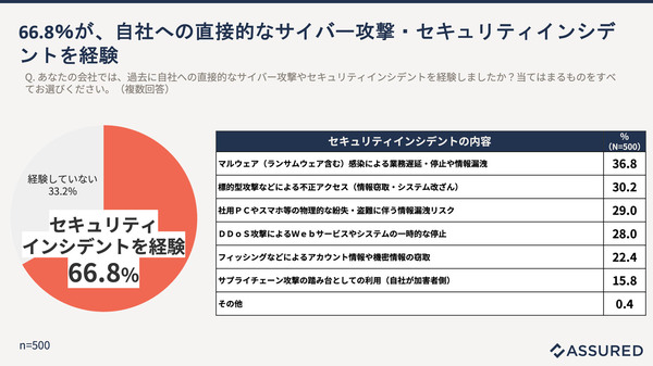 図3:自社への直接的な攻撃を経験した割合とインシデントの内容(出典:アシュアード)拡大画像表示