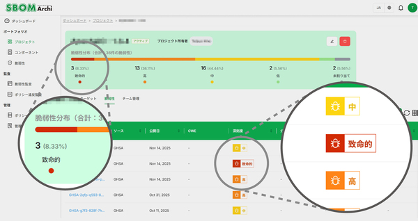 図2は、SBOM Archi」の利用の流れを示したものである。企業のシステム管理者が、入手したSBOMや実環境をスキャナで調べて生成したSBOMを管理サイトにアップロードすると診断が始まる。ライブラリなどの部品に潜む脆弱性やライセンス違反、EOL/EOSリスクを自動で検出し、一覧にする(画面1)。