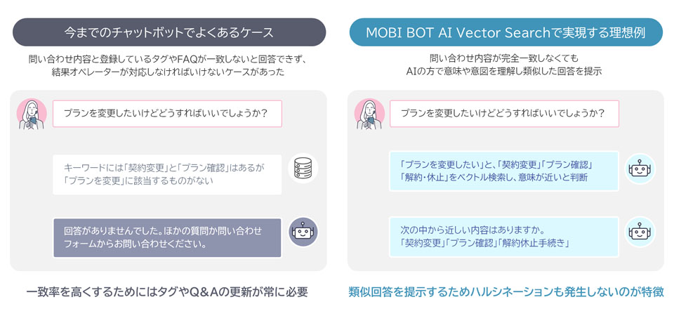 図1:チャットボットにおける、キーワード検索型とベクトル検索型の違い(出典:モビルス)拡大画像表示