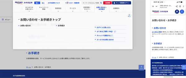 画面1:「MOBI BOT AI Vector Search」でチャットボットを刷新した、みずほ証券の問い合わせページ(出典:モビルス)拡大画像表示