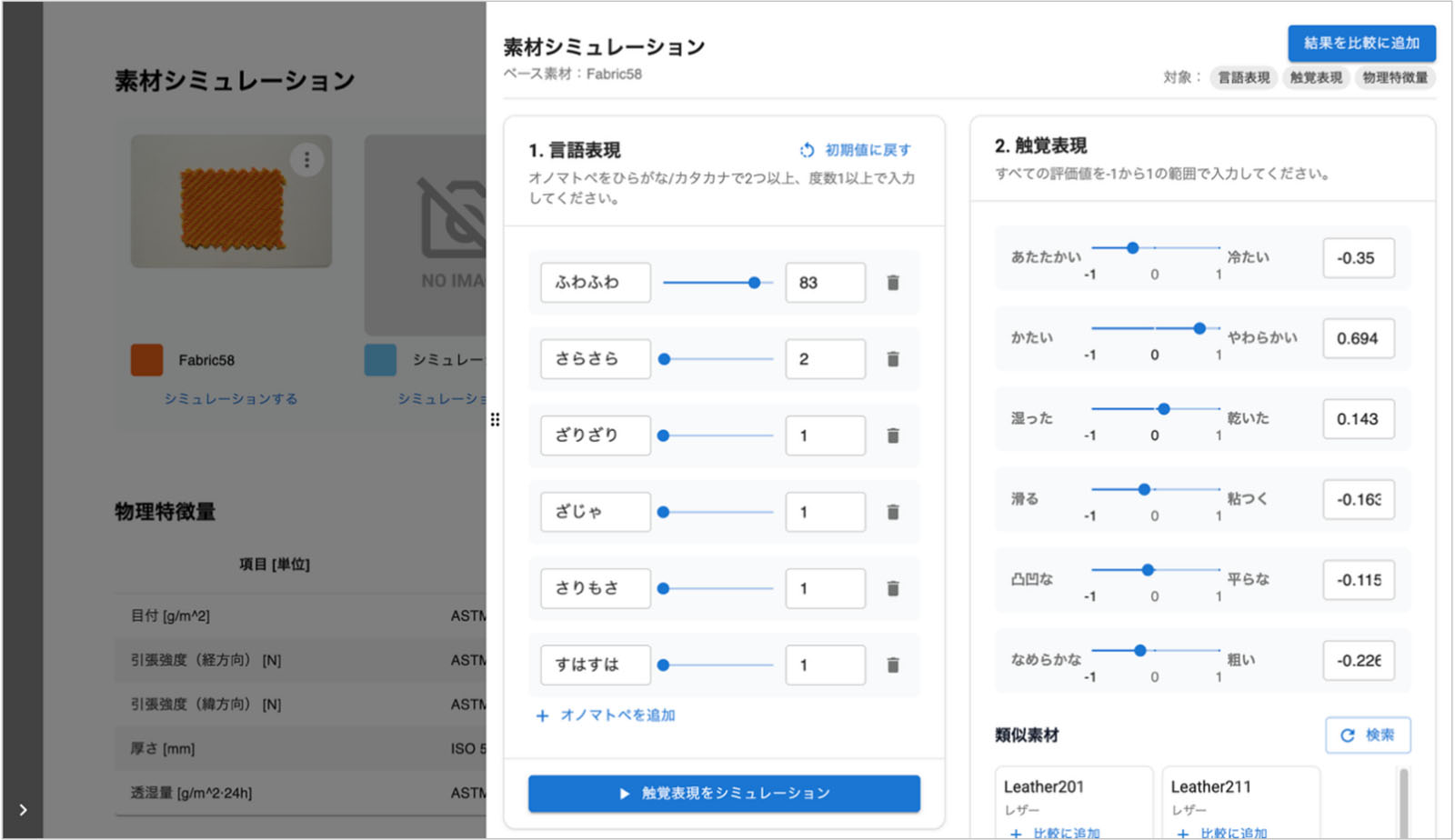 画面1:素材探索・開発ツール「感性AI MateriaLink」に追加した素材シミュレーション機能の画面(出典:感性AI)拡大画像表示