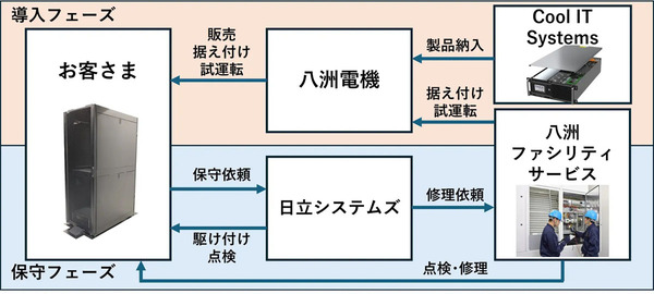 図1:水冷サーバー用直接液冷システムの販売から保守までを一貫して提供するサービスの流れ(出典:八洲電機、日立システムズ)拡大画像表示