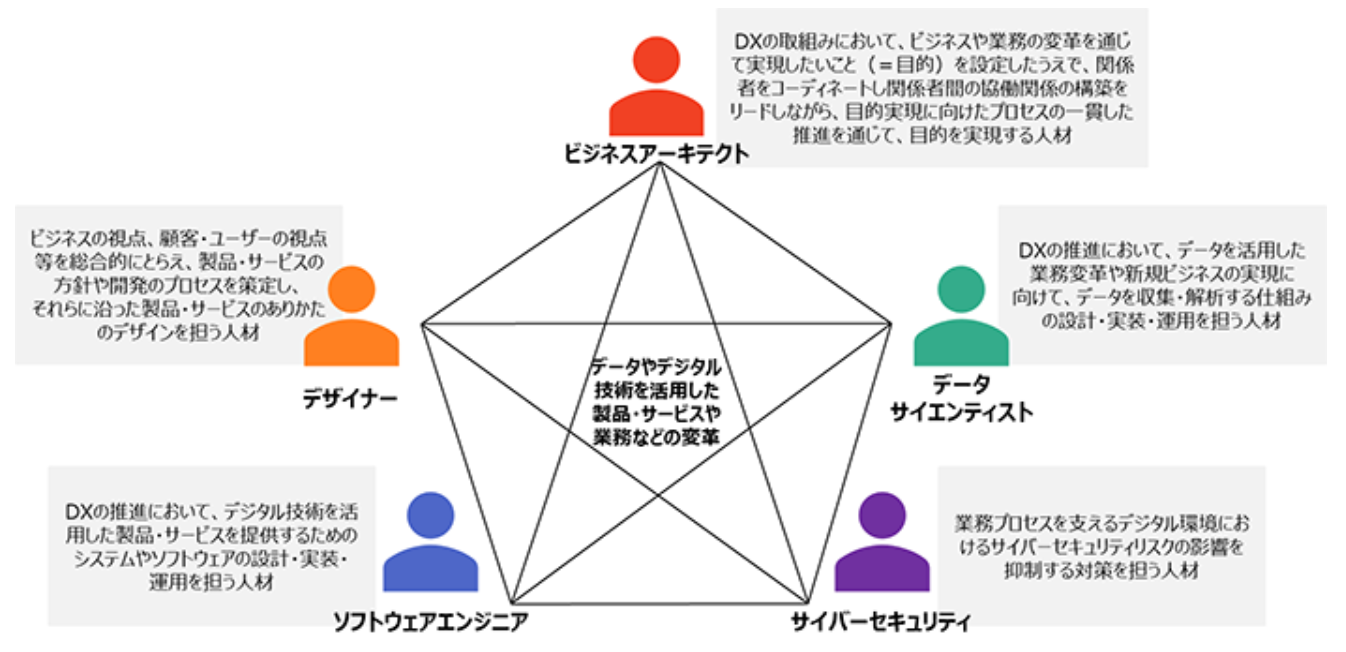 さて、ここからは「で・ある調」で書かせていただく。情報処理推進機構(IPA)が策定した「DX推進スキル標準(DSS-P)」では、企業や組織においてDXを推進する主な人材として5つの人材類型を定義している。