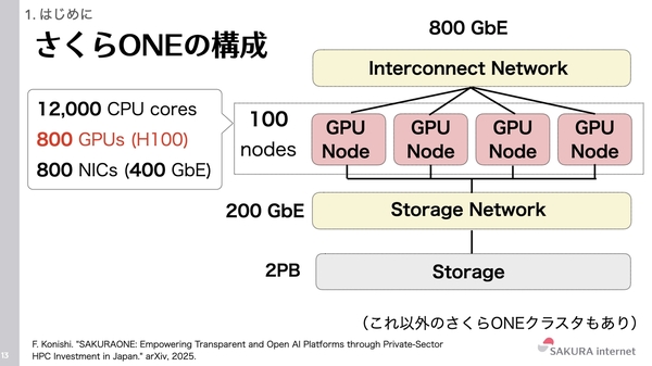 こうした市場ニーズを受け、さくらインターネットは旺盛なGPU需要に早急に応えるべく、800基のGPUを搭載した大規模HPCクラスタ/スーパーコンピュータ「さくらONE」の構築プロジェクトを2024年8月に開始した(図1、関連記事:さくらインターネット、マネージドスパコン「さくらONE」にNVIDIA B200搭載ノード48台構成を追加)。