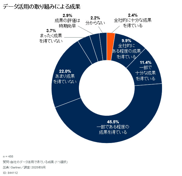 ガートナージャパンは2026年1月8日、日本企業のデータ活用に関する調査結果(2025年9月調査)を発表した。調査は、企業に所属する個人を対象に実施した。データ活用に関して、「全社的に十分な成果を得ている」と回答した割合は2.4%、「一部で十分な成果を得ている」とする回答者は11.4%だった。これらを合わせた、一部であっても十分な成果を得ているとする回答者は、13.8%にとどまった。一方、何らかの成果を得ている回答者まで広げると割合は7割近くになる。