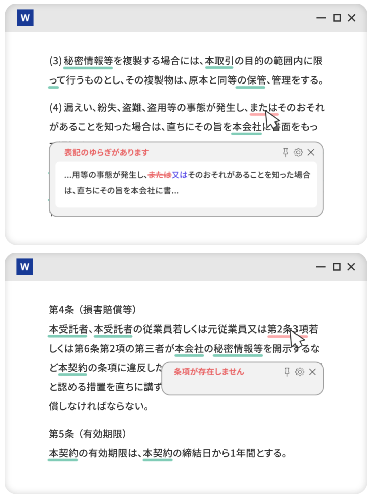 こうした課題を解決するため、BoostDraftが提供する法務向け総合文書エディタ「BoostDraft」(画面1)を採用した。Microsoft Wordのアドインとして動作するソフトウェアで、契約書の形式的な修正や表記ゆれの検出などを自動化・効率化する機能を備える。インターネット接続を必須とせず、スタンドアロンで動作するため、機密性の高い契約書データを外部に送信することなく利用できる点も評価した。