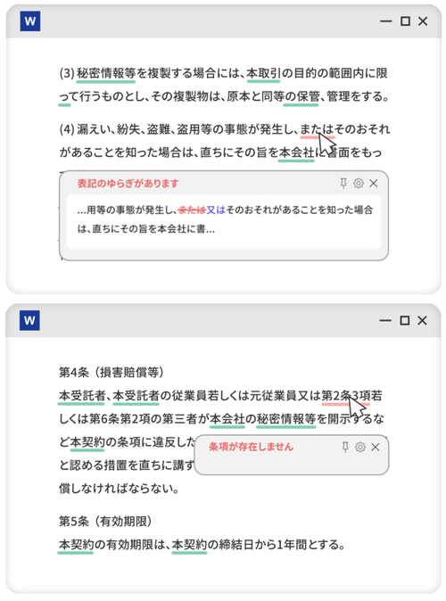 導入後は、特に長文や英文の契約書において顕著な効果が出ているという。法務知的財産本部の金森氏は、「感覚的には1回の確認につき5分から10分ほどの削減になっている」としている。また、これまで目視で行っていた「及び/および」といった表記ゆれもツールが自動で指摘するため、ミスの防止と契約書品質の向上にも寄与している。