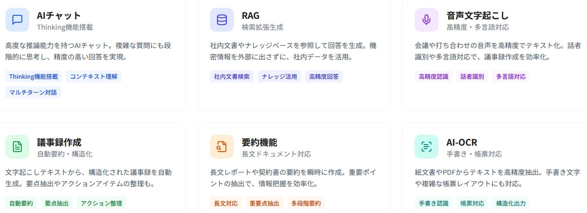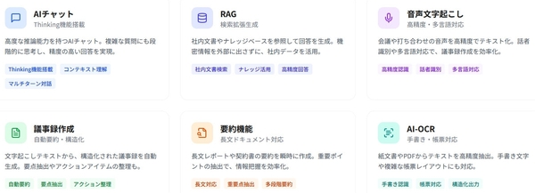 機能面では、社内規程やマニュアル、過去の資料などを参照しながら回答を生成するRAG構成により、「社内にしかない情報」に基づいた実務レベルの回答生成が可能になる。また、非定型帳票や手書き文字に対応するAI-OCRや会議音声の要約・文字起こし・議事録作成などの機能を1つのシステムから利用できる。