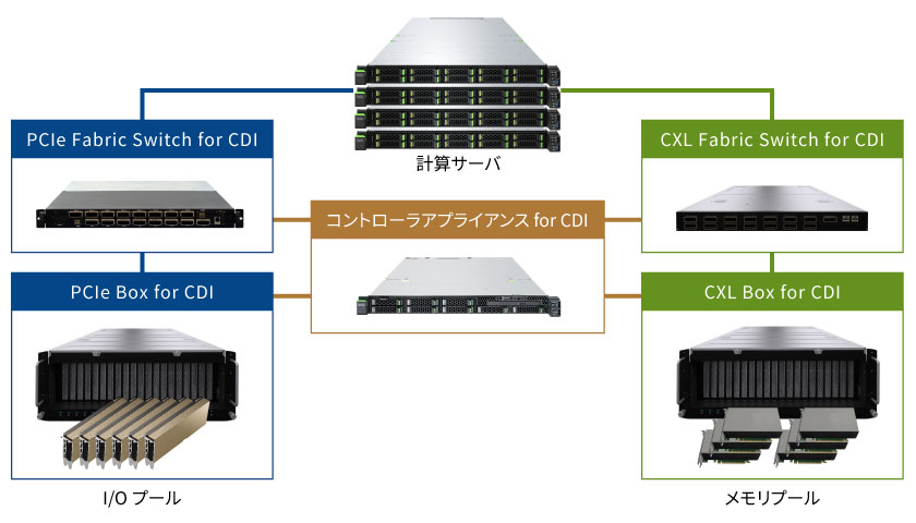 CDI V2では、従来モデルのV1.1から提供しているGPUやSSDなどのI/Oリソースプーリング機構に加えて、CXLメモリプーリング機構を利用できるようにした。外部のCXLボックスで共有したメモリーリソースを、指定したサーバーに必要な分を動的に割り当てることができる。これにより、従来の固定的な構成で生じていたメモリ容量の無駄を排除して稼働率を高められる。