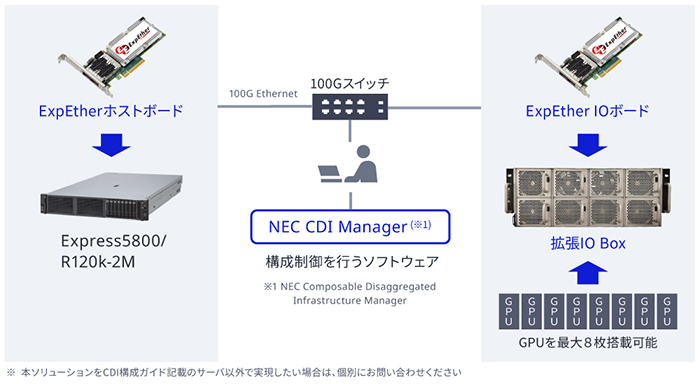 提供するシステムは、PCサーバーに装着するExpEtherのホストカード(100GbE)、GPUを最大8基搭載可能な拡張I/Oボックス(外部接続用ExpEtherカードを含む)、GPUの割り当てなどのシステム構成を制御する管理サーバーソフトウェア「NEC Composable Disaggregated Infrastructure Manager(NEC CDI Manager)」で構成する。