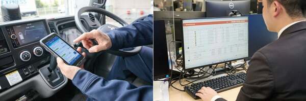 今回の試験導入では、ドライバーが携行するスマートフォン上の専用アプリと管理システムを連携。これにより、車両の位置情報や配送ステータス(配送中、到着、荷積み/荷下ろし中など)をリアルタイムにクラウド上で共有・管理できるようにした(写真1)。