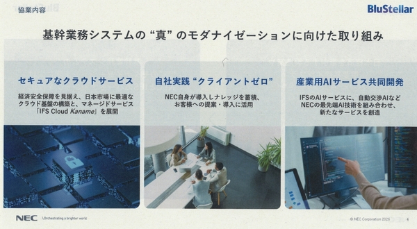 NECとIFSジャパンは2025年1月16日、説明会を開き、パートナーシップの強化と日本市場向けの「IFS Cloud」や産業用AIに関する取り組みを発表した。日本の基幹産業/重要インフラが直面する課題を受け、基幹システムのモダナイゼーションを共同で促進する。具体的には、国内完結型のIFS Cloudの基盤構築、これを活用した日本市場特化のマネージドサービス「IFS Cloud Kaname」の提供、産業用AIサービスの共同開発などを進めていく。
